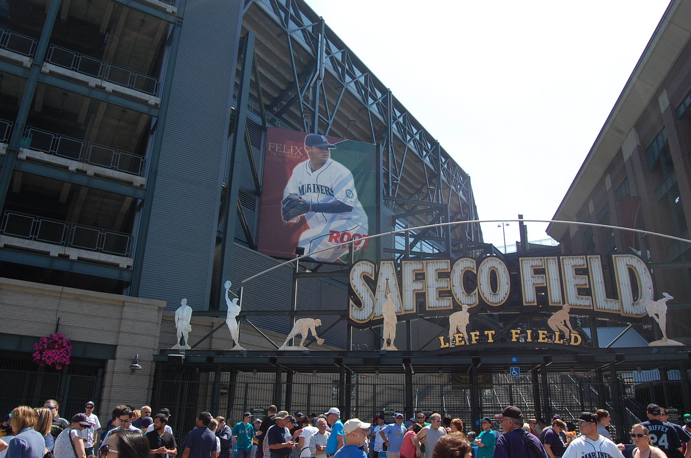 Seattle. La ville est étendue, grouillante. Là aussi, on est loin de Vancouver. De loin se détache la Space needle, sorte Tour Eiffel locale. La ville est très sympa, typiquement américaine, immeubles en briques rouges, escaliers de secours à la New-Yorkaise. Le burger tant attend arrive. Petit resto dans le quartier des pionniers. Il doit y avoir un match cet après-midi, le pub est rempli de fans qui portent des maillots flanqués d’un nom, Griffey, et du numéro 24. NFL, MLS, Baseball, avant d’être une ville rock, Seattle est d’abord une ville américaine. Le samedi, jour de match, le sport est dans la rue. Les stades sont à deux pas. Aujourd’hui,c’est baseball, les Mariners de Seattle reçoivent les Milwaukee Brewers et la ville est en ébullition. Le match aura lieu dans l’après-midi et sera suivi par la présentation de Ken Griffey Jr au Hall of Fame du baseball. Un autre monde.