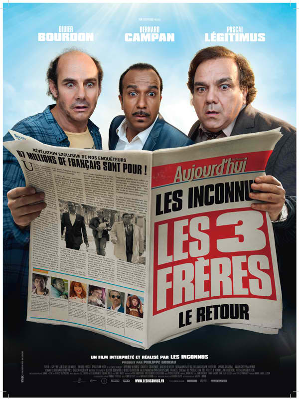 Dimanche après-midi, pluie, nuit tombante, même pas peur, allons-y, direction la grande salle pour un programme familial, laminé par la presse. Note moyenne sur allociné : 2/5…ça promet. Mais moi aussi, je suis de la génération des gallinettes cendrées, des Youpi matin (j’ai beau être matinal, j’ai mal) et autres Romano Sucarescu. S’il me reste une once de pitié, je l’accorderai aux Inconnus en souvenir de MON adolescence. Je m’attends au pire. Les promos télévisuelles des derniers jours sentaient l’ennui à crever, le calcul marketing, financier, tout ce que vous voulez mais certainement pas la fraicheur. Rien qu’à voir le visage de Didier Bourdon on sentait monter un léger malaise…Je m’attendais à un summum de cynisme mercantile dans la même veine que Les bronzés 3 qui avaient fait injure à la mémoire du planter de bâton.